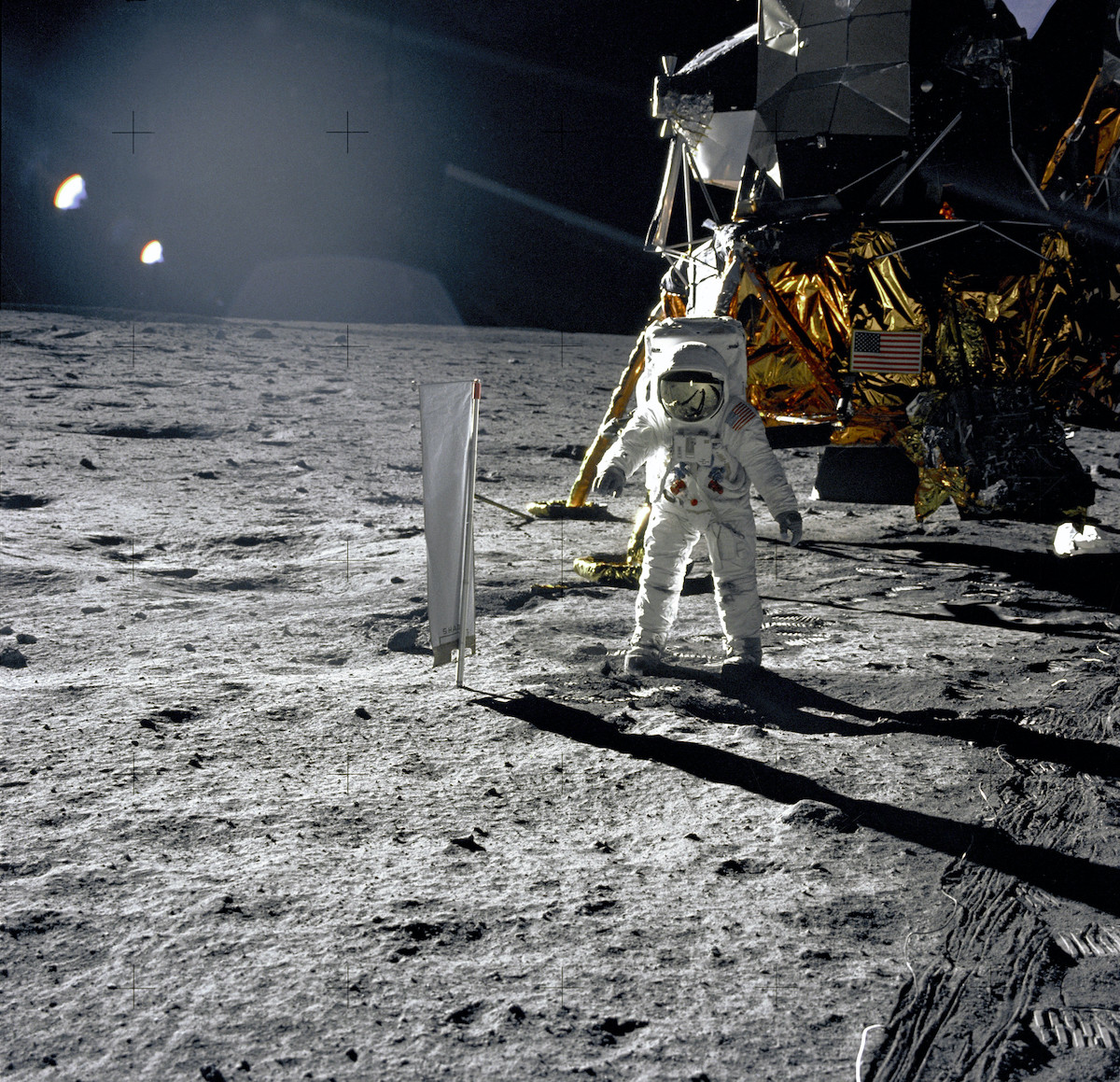 Havia um terceiro astronauta, Michael Collins, na missão lançada pelo foguete Saturno 5 desde o Centro Espacial Kennedy, em Cabo Canaveral, Flórida, em 16 de julho. Mas, como ele permaneceu sozinho em órbita no módulo de comando Columbia, enquanto seus companheiros, levados pelo módulo de alunissagem, o Eagle (Águia), gastavam quase duas horas e meia em atividades na Lua, entre outras coisas recolhendo 21,5 kg de material, tirando fotos e instalando aparelhos de medição, seu nome ficou na sombra.