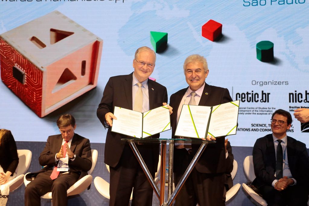 O ministro Marcos Pontes, o presidente da Fapesp, Marco Antonio Zago, e o conselheiro do Comitê Gestor da Internet no Brasil, Eduardo Fumes Parajo, assinaram publicamente o documento durante a cerimônia de abertura do Fórum Regional.