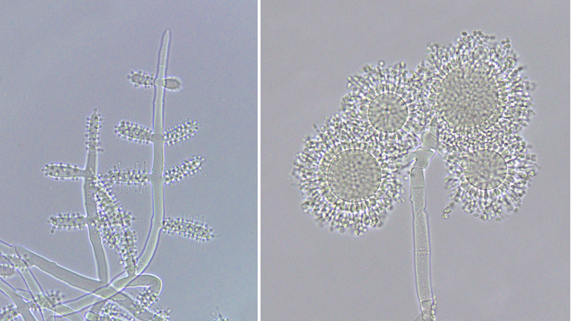 Fotos de microscopia, com aumento de 40 vezes, mostram conidióforo com as vesículas cilíndricas da espécie Escovopsis weberi, mais eficientes na reprodução assexuada (à esq.) e vesículas globosas de Escovopsis papillata (dir.), espécie mais próxima do ancestral comum do gênero e menos eficiente nesse tipo de reprodução (imagens: Quimi Vidaurre Montoya / IB-Unesp)