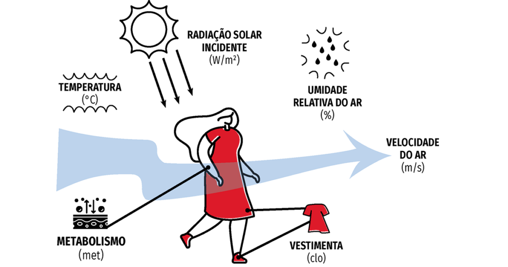 Como o conforto ambiental trata de sensações, os parâmetros que o definem são relativos. Eles incluem desde a temperatura ambiente até as roupas que usamos, passando pelo metabolismo de cada pessoa (ilustração cedida pela pesquisadora)