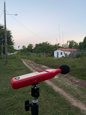 A pesquisadora utilizou um sonômetro para medir a pressão sonora de diversos pontos ao redor das comunidades (foto: Marília Amorim, pesquisadora)