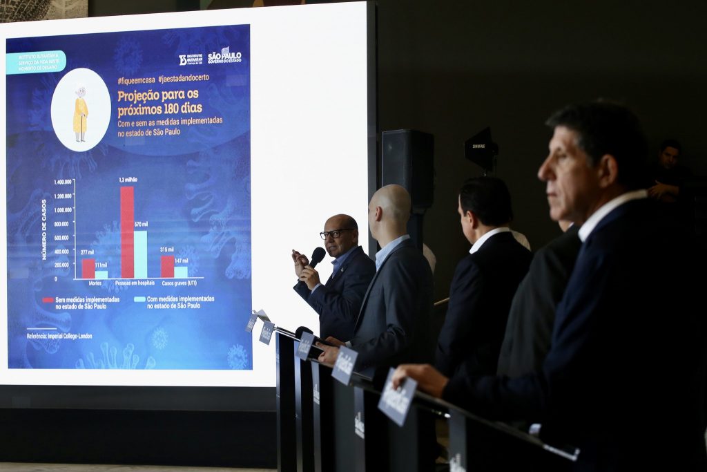 Os dados da epidemia em São Paulo, dos resultados obtidos com a decisão de adotar o distanciamento social e, em seguida, o fechamento do comércio e serviços, à exceção dos ligados a atividades essenciais, vis-à-vis os números que teríamos hoje sem a adoção das medidas, foram amplamente mostrados em gráficos bem produzidos e bastante explicados nas quase duas horas da coletiva do governador e equipe. A estrutura hospitalar de São Paulo para atender os desafios que devem crescer nas duas próximas semanas também foi bastante esmiuçada pelos pesquisadores e médicos que se sucederam no microfone.