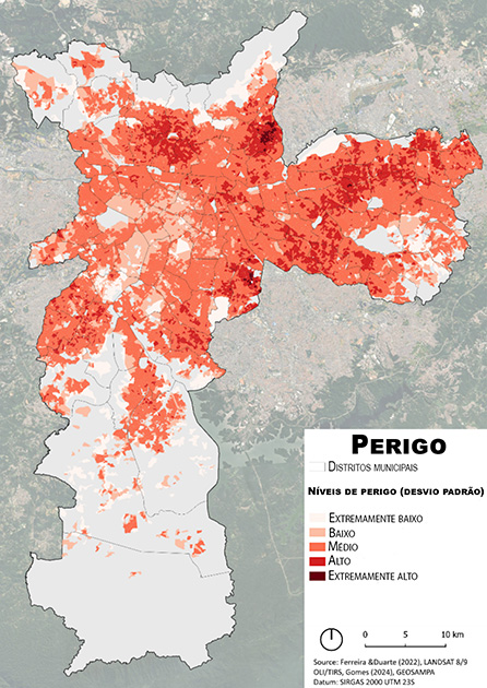 No caso de São Paulo, o resultado é claro: os setores classificados com risco alto ou extremamente alto concentram-se sobretudo nas favelas. Nelas, se observam temperaturas mais elevadas, menor cobertura vegetal, maior impermeabilização do solo, elevada densidade populacional com renda mais baixa e maior proporção de crianças.