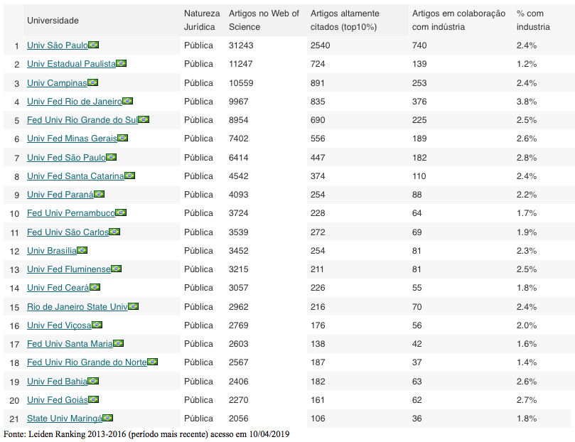 A expansão notável, fruto de algumas políticas muito bem estruturadas que estão a merecer outros comentários no Ciência na rua, foi baseada na capacidade de produzir ciência das universidades públicas brasileiras, com a Universidade de São Paulo (USP) e a Universidade Estadual de Campinas (Unicamp), ou seja, duas grandes universidades estaduais paulistas, mais algumas grandes universidades federais, como a do Rio de Janeiro (UFRJ), a de Minas Gerais (UFMG) e a do Rio Grande do Sul (UFRGS), na liderança desse processo. Mais de 95% dessa produção científica do Brasil nas bases internacionais deve-se, assim, à capacidade de pesquisa de suas universidades públicas.