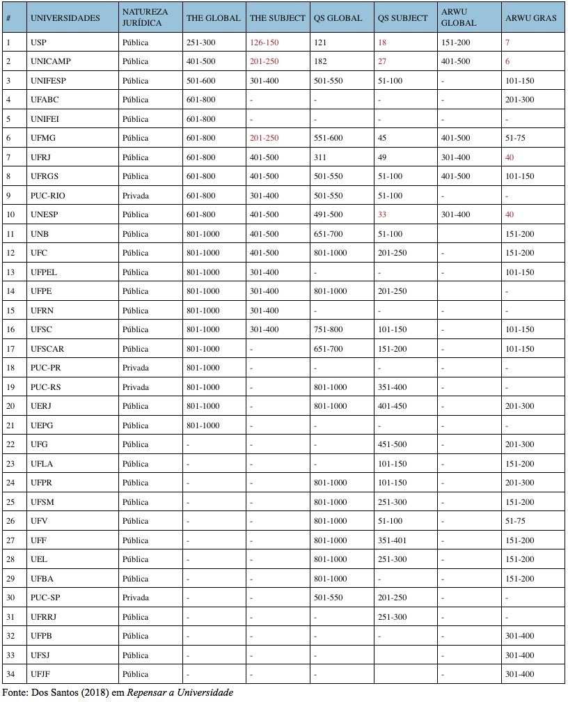 A segunda (aqui), modificada do capítulo de autoria de Solange Santos na obra coletiva Repensar a Universidade (Repensar a universidade: desempenho acadêmico e comparações internacionais, organizado por Jacques Marcovitch, 256 pp, São Paulo, ComArte, 2018, disponível para download em https://www.livrosabertos.sibi.usp.br/portaldelivrosUSP/catalog/book/224), mostra resultados de todas as universidades no Brasil em rankings internacionais e, ele observa, “aparecem apenas as PUCs em termos de privadas, e em posições relativamente baixas”.